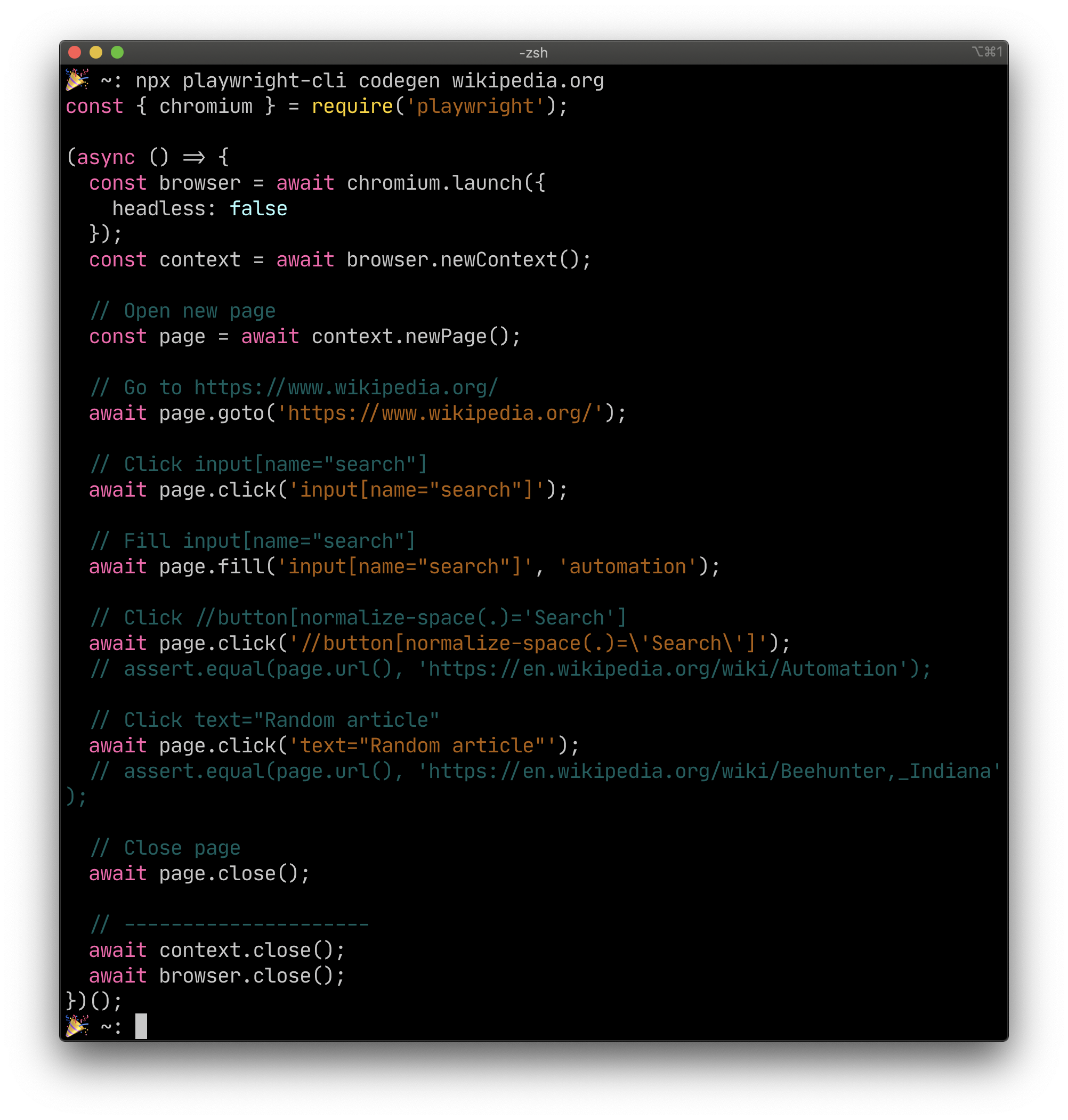 Open a new terminal and execute npx playwright-cli codegen wikipedia.org