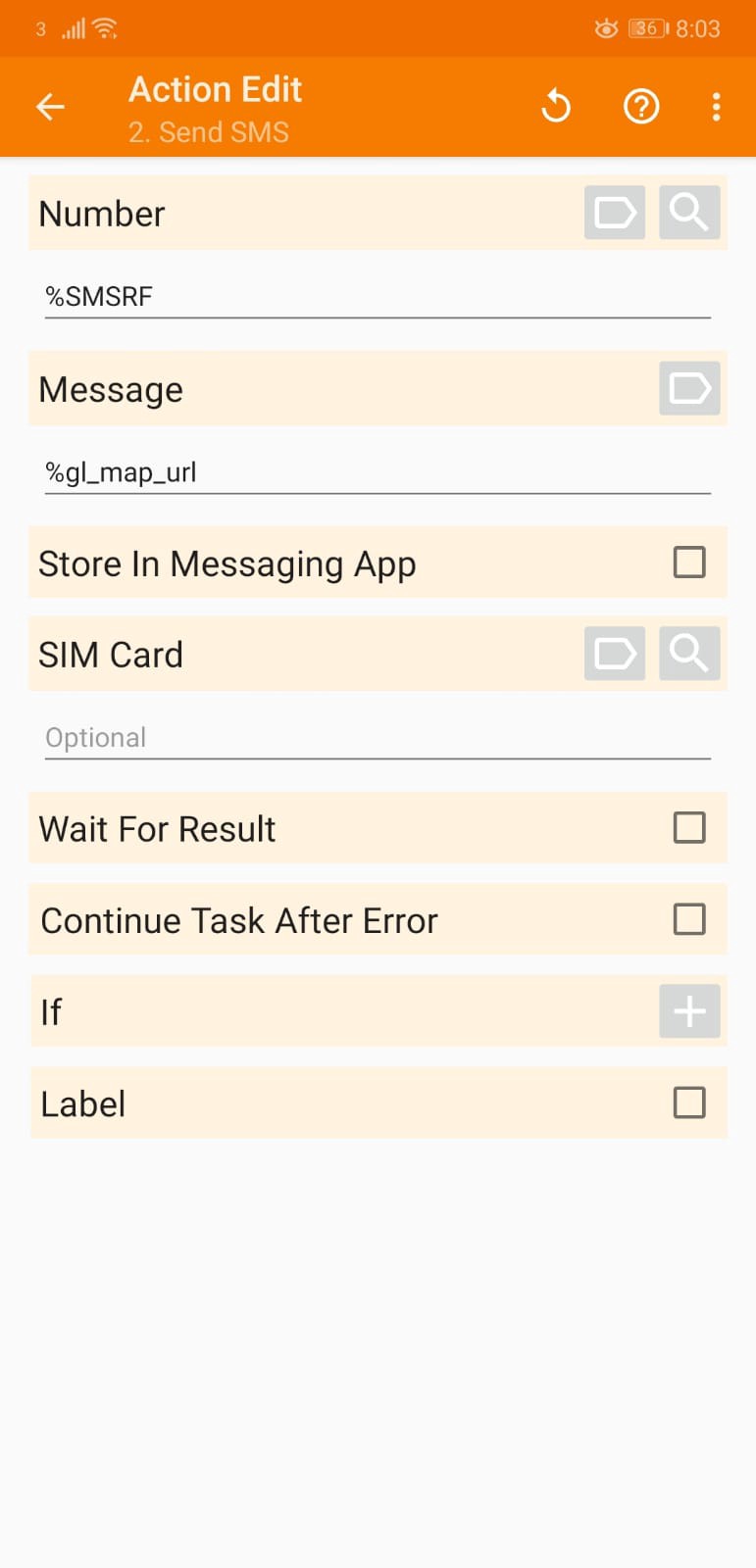 Now set the number to %SMSRF and set the message to %gl_map_url.